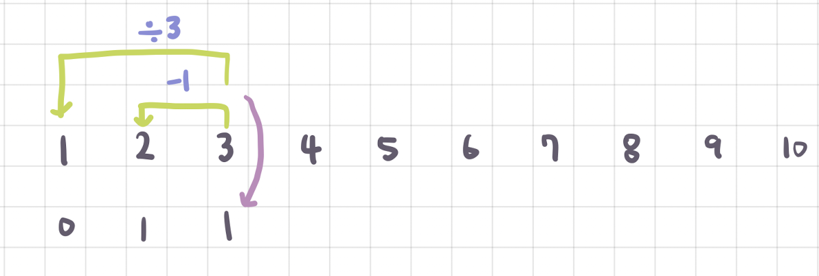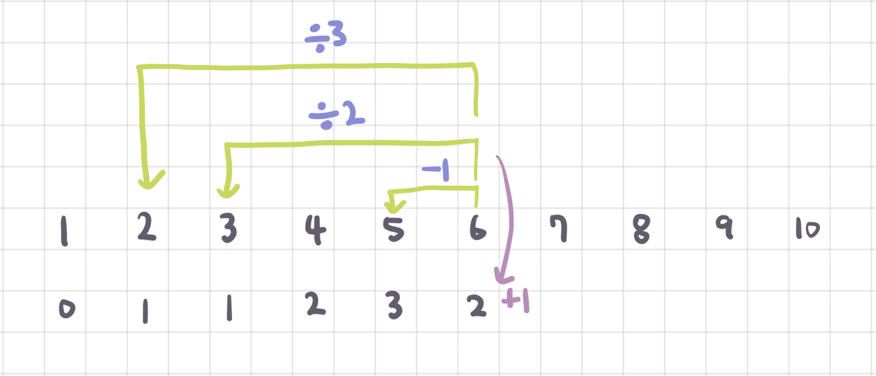 3으로 나눈 값, 2로 나눈 값, 1을 뺀 값 모두 비교해서 최솟값에 1을 더하여 저장한다.