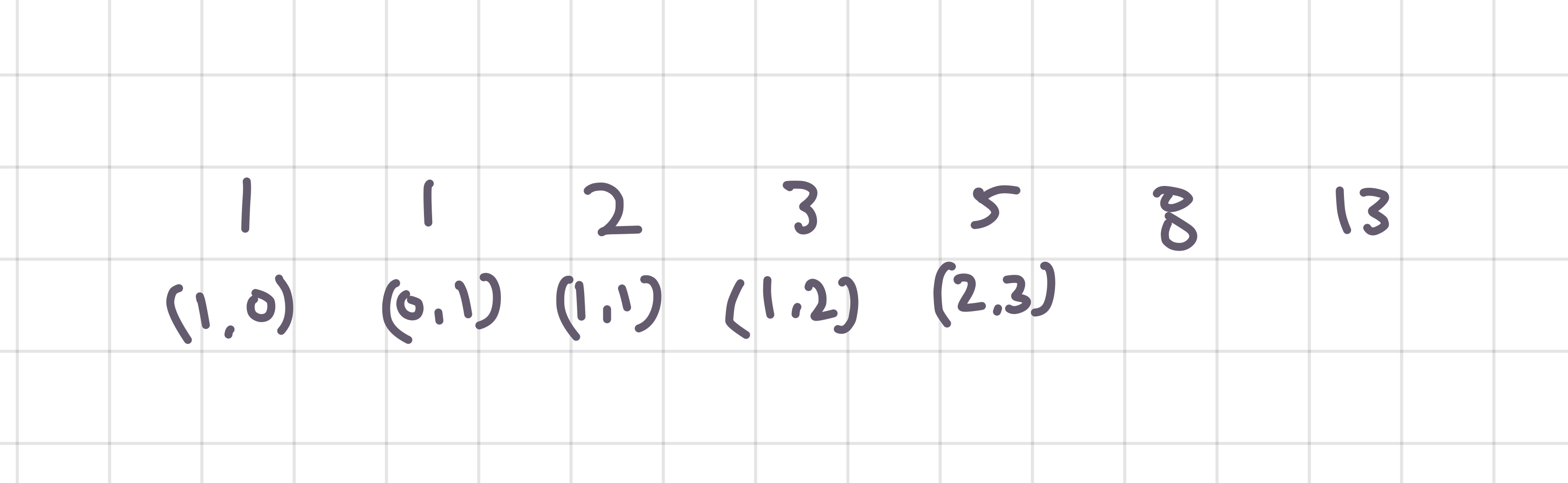 import java.io.*; class Main { static BufferedWriter bw = new BufferedWriter(new OutputStreamWriter(System.out)); public static void main(String[] args) throws IOException { BufferedReader br = new BufferedReader(new InputStreamReader(System.in)); int T = Integer.parseInt(br.readLine()); int[][] dp = new int[41][2]; dp[0][0] = 1; dp[0][1] = 0; dp[1][0] = 0; dp[1][1] = 1; for (int i = 2; i < 41; i++) { dp[i][0] = dp[i - 1][0] + dp[i - 2][0]; dp[i][1] = dp[i - 1][1] + dp[i - 2][1]; } for (int i = 0; i < T; i++) { int n = Integer.parseInt(br.readLine()); bw.write(dp[n][0] + " " + dp[n][1]); bw.write("\n"); } bw.flush(); } }반응형