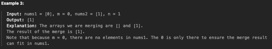문제의 예시 2번에서는 nums2의 길이 n=0이라면 nums2는 비어있는 배열이고, 예시 3번에서는 nums1의 길이 m=0이라면 0이라는 요소가 존재한다.