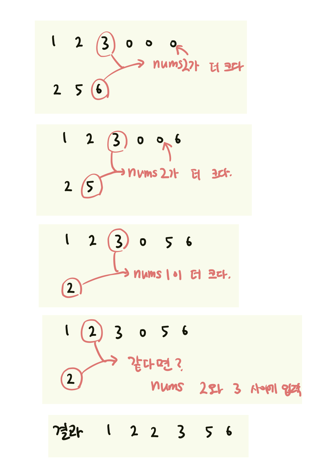 이미 정렬되어있는 배열들이며 nums1이 유효하지 않은 부분을 nums2로 채우면서 순서를 정렬해야한다.