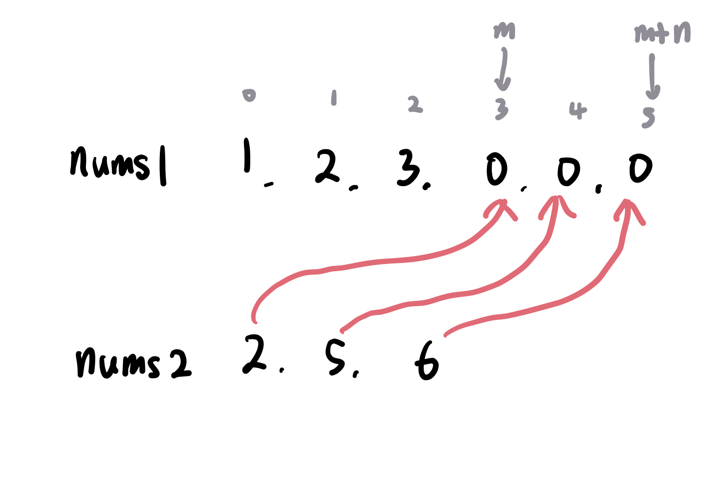 예시 1번을 보면 nums1의 실제 길이는 6인데 m의 값은 3이다. nums2의 실제길이는 3인데 n도 똑같은 값이다.