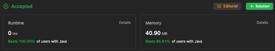 class Solution { public void merge(int[] nums1, int m, int[] nums2, int n) { for(int i = m ; i < m + n ; i++){ nums1[i] = nums2[i-m]; } Arrays.sort(nums1); } }제출 결과는 다음과 같았다.