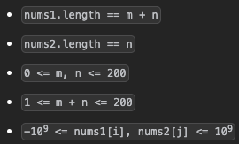 이를 통해서 m=0이라면 nums1의 내부 요소는 무시하고 n=0이라면 nums2라는 배열 자체를 무시해야한다는 의미로 일단 이해하고 넘어갔다.제한