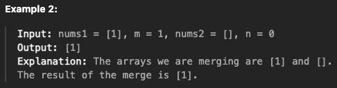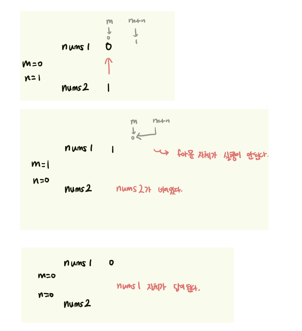 문제의 예시 2번에서는 nums2의 길이 n=0이라면 nums2는 비어있는 배열이고, 예시 3번에서는 nums1의 길이 m=0이라면 0이라는 요소가 존재한다.
