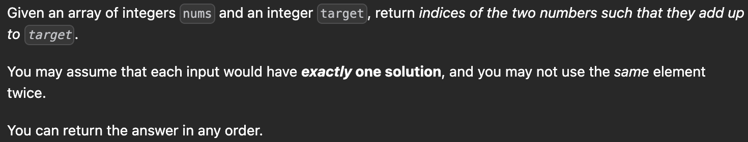 해쉬맵을 사용해서 target의 값과 nums[i]의 값의 차이를 조회해서 만약 존재한다면 그 값이 정답이다. 하지만 해쉬맵이 초기에는 비어있으므로 존재하지 않다면 put을 통해 해쉬맵에 내용을 저장해주면서 반복하다보면 O(N)만에 정답을 구할 수 있게 된다.
