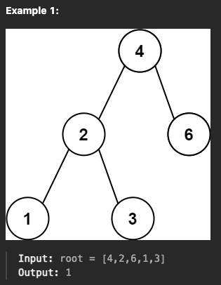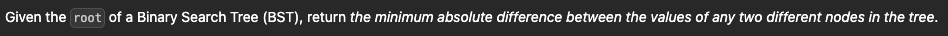이진 탐색 트리(BST)가 주어질 때, 트리의 두 노드간 가장 작은 차이를 찾고 그 값의 절대값을 반환하는 문제이다.