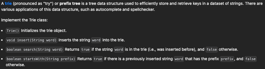 Trie() 는 trie 객체의 시작을 구현해야하고, insert()는 word라는 문자열을 trie 트리에 입력을 구현, search()는 문자열 word가 trie에 존재하는지를 구현하고, startsWith()는 접두사 문자열 prefix가 주어질 때 접두사가 일치하는 단어가 존재하는지를 구현해야한다.